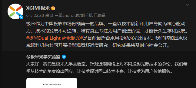对于三色激光技术问题,极米科技在微博中表示:“嘴仗无益,眼见为实。6月9日下午14点,感兴趣的朋友可以莅临宜宾极米光电产业园实地体验,欢迎大家通过极米官方微博与我们取得联系。”同时,极米科技还在微博中引用了极米光学实验室的数据来支持其立场。
