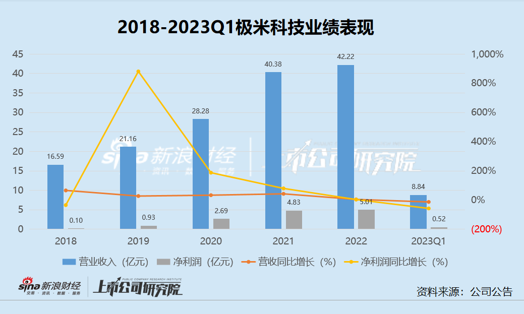 2022年极米科技实现营业收入42.22亿元,同比增长4.57%,实现净利润5.01亿元,同比增长3.64%。尽管仍然保持了增长趋势,但在2021年及之前,极米科技的营收增速均在30%以上,净利润增长每年都近乎翻倍。