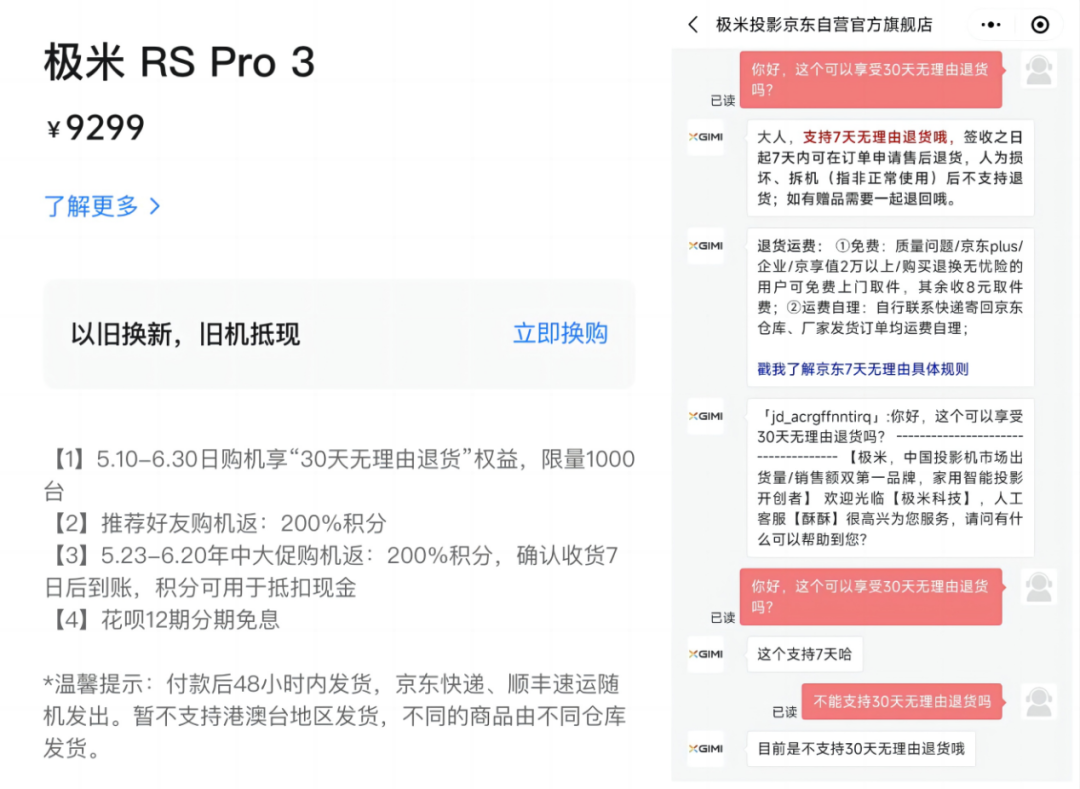 然而,一些细心的网友发现,尽管极米声称提供30天无理由退货,但实际上存在一些限制和条件。这些限制包括限制退货平台和名额。有网友在京东上向客服咨询,得到的答复是只支持7天无理由退货,这与极米所宣传的30天存在差异。
