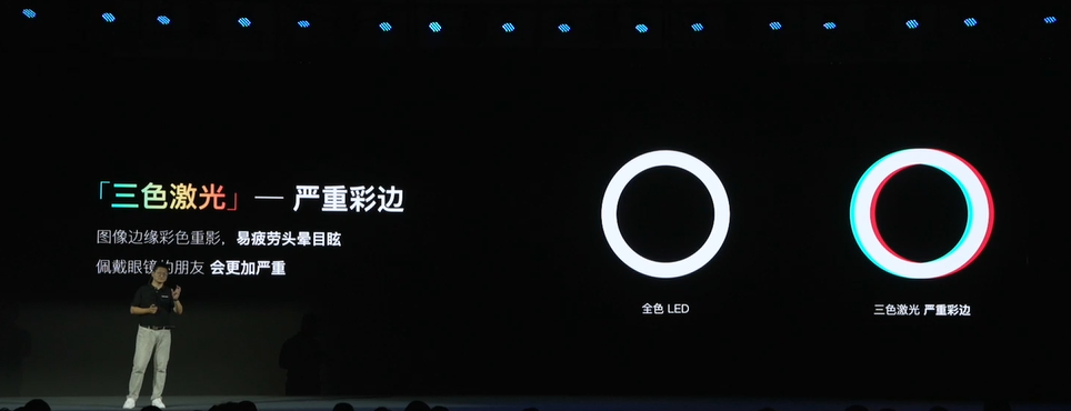 极米科技CMO田峰表示,几年前,我们深入研究和尝试三色激光技术,但最终不得不放弃。与我们在自然界中看到的连续光谱不同,三色激光由RGB三个极窄波段组成,这种非连续光谱具有过窄的波段,导致严重的散斑和色彩分离现象。这对观影者,尤其是孩子们的眼睛造成严重不适。