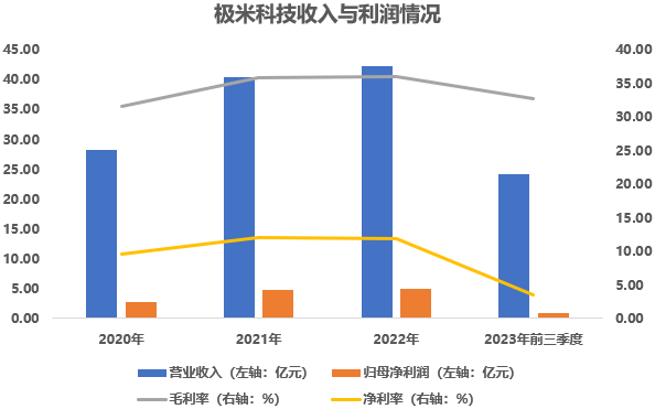 2023年以来的多个报告期,极米科技的收入较2022年同期相比则出现了下降;2023年前三季度,极米科技的收入为24.22亿元,较2022年同期相比下降了15.98%。需要注意的是,为了提高公司产品销量,2023年第三季度极米科技的毛利率下降到29.46%,较此前33%以上的毛利率下降了近4个百分点。但据计算,2023年第三季度,极米科技的期间费用率高达33.1%,因此当期公司扣除非经常性损益后的净利润为-1639万元。
