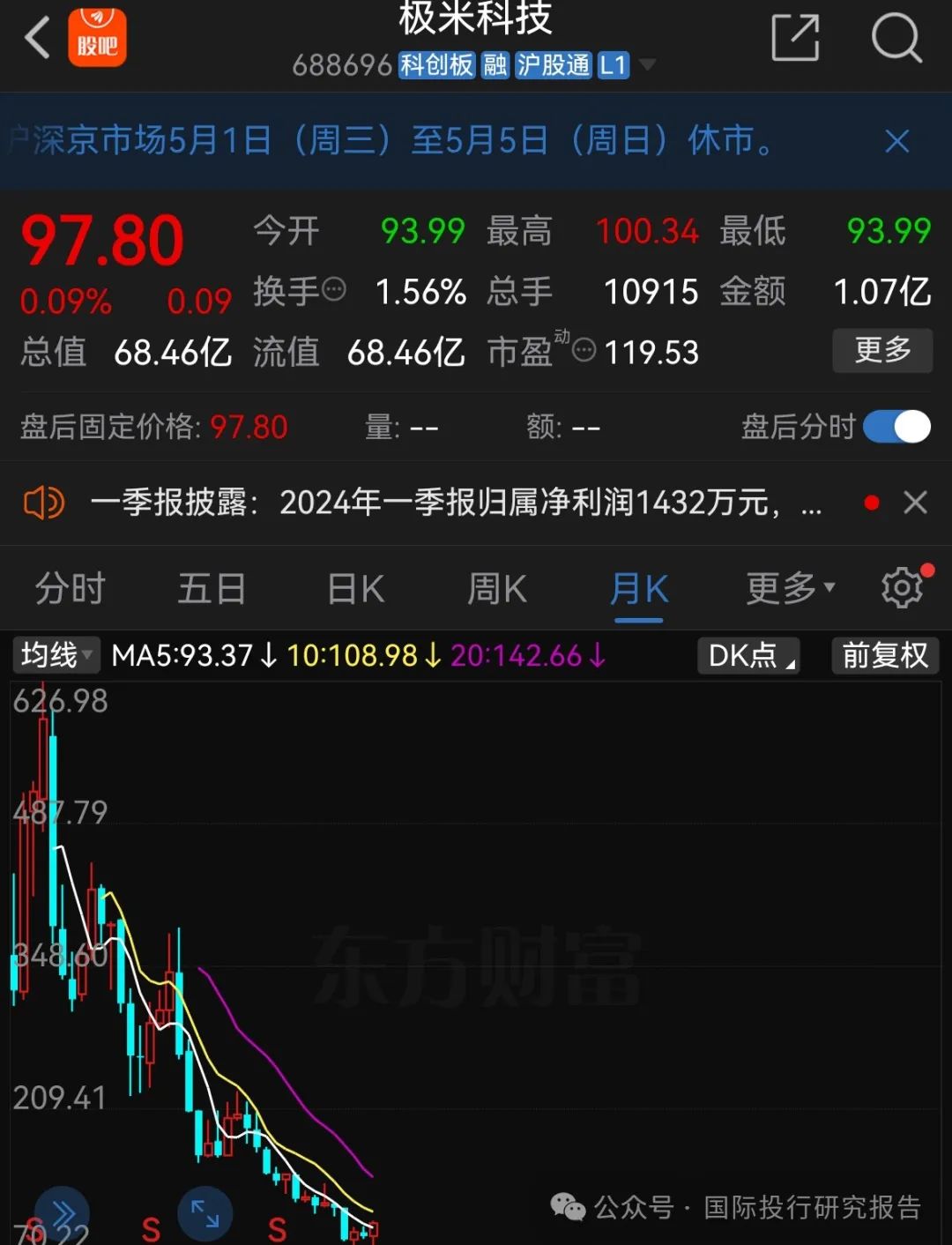 2、极米科技IPO发行价高达133.73元/股。公司上市后也获得各路资金热捧,上市首日股价最高涨幅超350%,最高股价880多元/股(后复权),而现在只有不到100元,前复权也只有200出头了