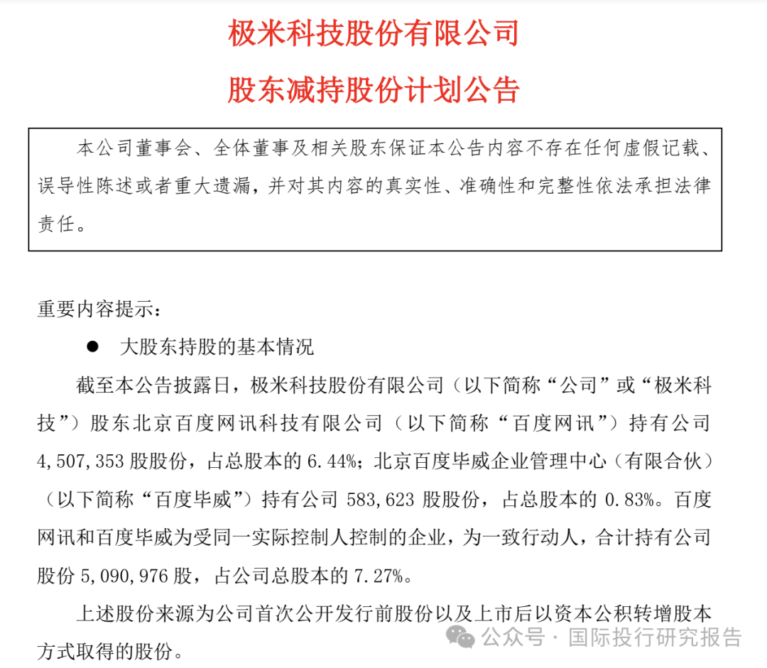 4月30日晚间,极米科技公告称,公司股东百度网讯和百度毕威分别拟减持不超过公司2.66%和0.34%的股份。百度网讯和百度毕威为李彦宏控制。如果减持顺利,百度系就不再是5%以上股东,可以清仓了。