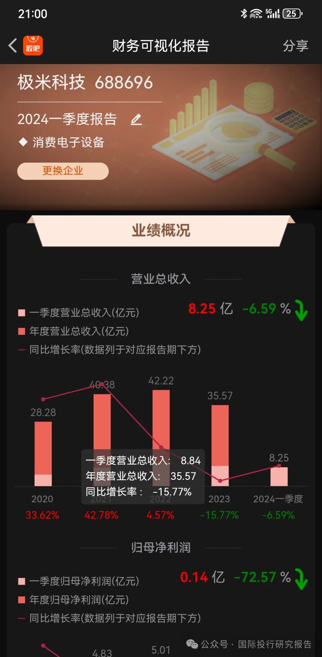 3、年4月29日晚间,极米科技发布2024年第一季度报告,公司一季度实现营业收入8.25亿元,同比减少6.59%;一季度归母净利润为1431.91万元,同比减少72.57%。这显示出在营收下滑幅度收窄的情况下,公司盈利能力继续大幅下降。