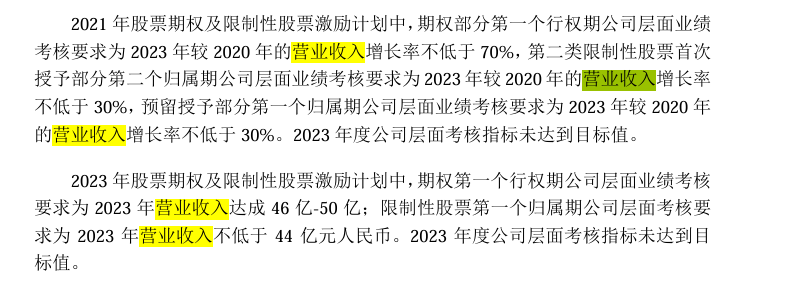 要知道,根据2021年股票期权及限制性股票激励计划,第一个行权期公司层面业绩要求2023年较2020年营收增长率不低于70%;第二类要求2023年较2020年营收增长率不低于30%;预留授予部分第一个归属期公司层面业绩考核要求为2023年较2020年的营收增长率不低于30%。