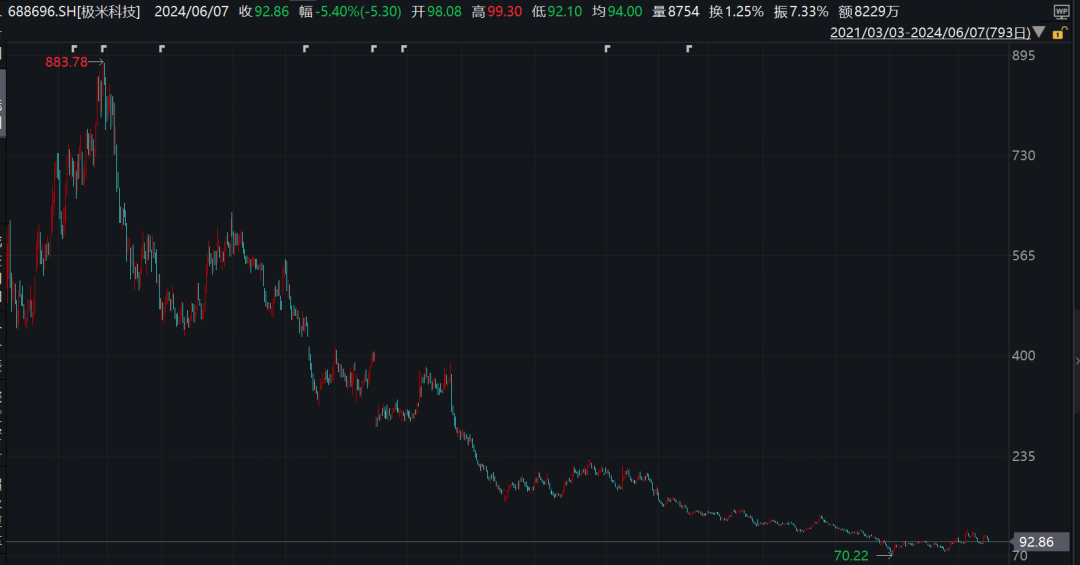 回顾2021年3月3日,极米科技以133.73元/股发行价登陆科创板,此后该股股价冲高至616元/股(前复权),成为当年最赚钱的新股。但截至6月7日收盘时,极米科技当日下跌5.4%,股价报收于92.86元/股。