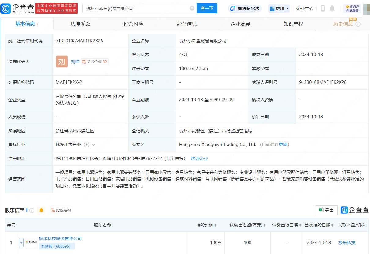 近日,杭州小乖鱼贸易有限公司成立,法定代表人为刘帅,注册资本为100万元人民币,经营范围包含:家用电器销售;家用电器安装服务;日用家电零售;家具销售;家具安装和维修服务;专业设计服务;家用电器零配件销售;日用电器修理等。股权穿透显示,该公司由极米科技(688696)全资持股。
