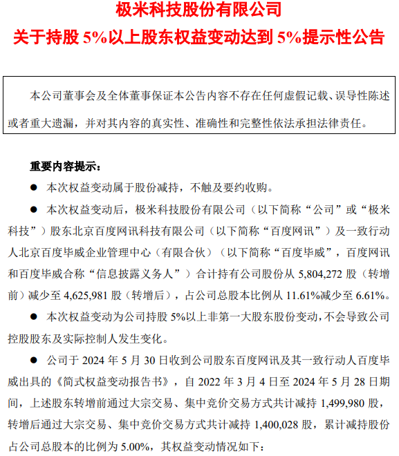根据公司公告,公司于 2024年5月30日收到公司股东北京百度网讯科技有限公司(以下简称“百度网讯”)及其一致行动人北京百度毕威企业管理中心(有限合伙)(以下简称“百度毕威”)出具的《简式权益变动报告书》,自2022年3月4日至2024年5月28日期间,上述股东转增前通过大宗交易、集中竞价交易方式共计减持 1,499,980 股,转增后通过大宗交易、集中竞价交易方式共计减持1,400,028股,累计减持股份占公司总股本的比例为5.00%,占公司总股本比例从11.61%减少至6.61%。