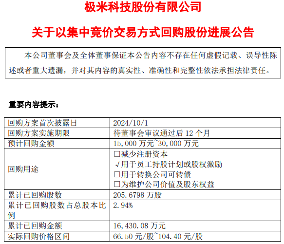 实际上,为了稳定股价,极米科技也采取了回购股份等措施。根据公司今年1月3日公告,2024年9月30日,极米科技董事会同意公司以集中竞价的方式回购公司股份,回购资金总额1.5亿元至3亿元,回购期限为12个月内。截至2024年12月31日,公司以集中竞价交易方式已累计回购公司股份205.6798万股,占公司总股本比例为2.94%,累计已支付回购股份的金额为16430.08万元。