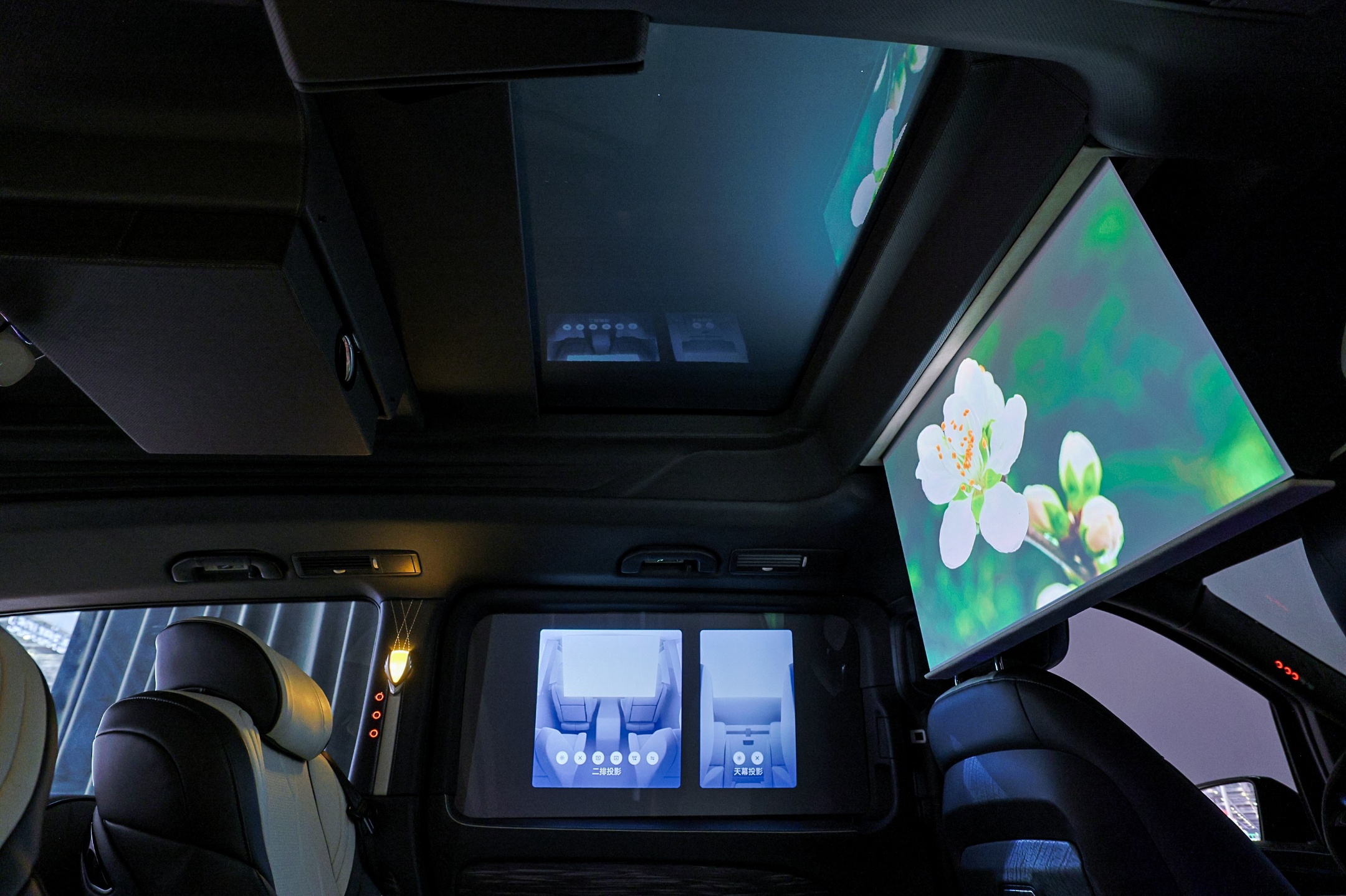 车内解决方案中,一机多投座舱投影、天幕投影和侧窗投影三大产品悉数登场。其中,一机多投座舱投影解决方案由极米科技专利设计,可以向前投射,打造车内大屏娱乐体验,且支持灵活的多档悬停功能;也可以在车尾箱升起时,以背投方式将画面投射到车尾幕布。另外,天幕投影实现了玻璃天幕与投影视觉的融合;侧窗投影可以通过触控车窗实现影音娱乐与全车投影矩阵的联动控制。