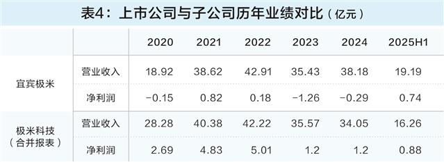 值得关注的是,作为全资子公司的宜宾极米,其营业收入经常性高于极米科技合并报表层面的营收。2022年宜宾极米营收比极米科技高出近7000万元;2024年,这一差距扩大至4亿元;2025年上半年,极米科技合并报表营收为16.26亿元,而宜宾极米实现营业收入19.19亿元,比上市公司高出近3亿元(表4)。