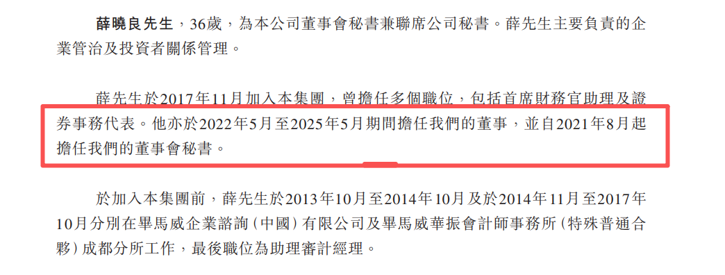 公开资料显示,薛晓良,36岁,为公司董事会秘书兼联席公司秘书。薛晓良主要负责的企业管治及投资者关系管理。薛晓良于2017年11月加入集团,曾担任多个职位,包括首席财务官助理及证券事务代表。他于2022年5月至2025年5月期间担任董事,并自2021年8月起担任董事会秘书。