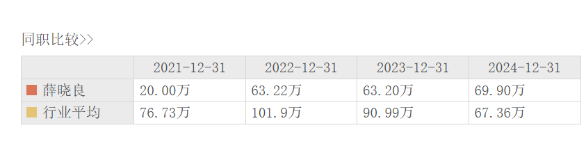 值得一提的是,薛晓良2024年薪酬为69.9万元,较2023年同期上涨6.7万元。