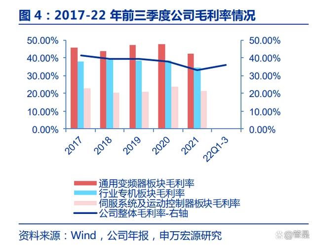公司海外战略稳扎稳打,初见成效。公司海外市场开拓策略清晰,目前公司针对海外市场的策略是将现有的成熟行业产品推向海外市场,再对海外其他行业进行拓展。目前公司建筑机械的升降机、永磁同步电机和同步磁阻电机驱动器等产品已在海外市场得到推广及应用。在海外渠道布局方面,公司主要通过经销商和印度子公司向海外市场销售,海外产品则主要以通用变频器为主,辅以专机、一体机进行推广。2022 年前三季度,公司海外收入 1.29 亿元,同比增长 149.19%,海外市场开拓初见成效。2020 年及 2021 年,公司海外业务毛利率均在 46%以上,我们预计未来几年公司海外业务营收占比有望继续提升,推动公司整体毛利率上行。