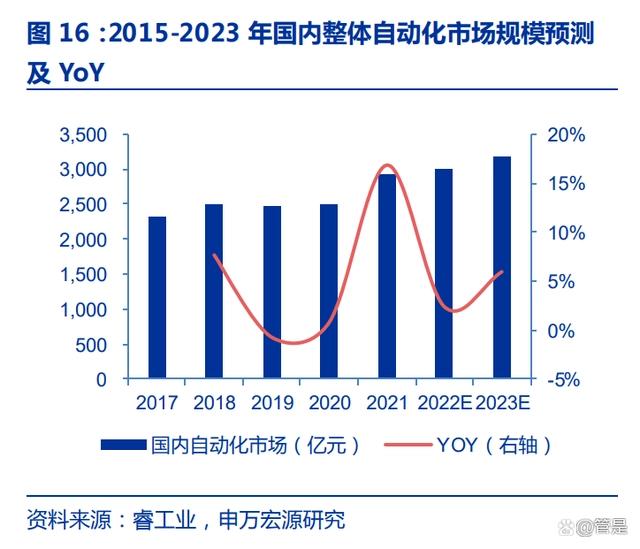 23 年国内工业自动化市场规模有望达到 3171 亿元。结合睿工业的数据,我们预测 23 年国内工业自动化市场规模将达到 3171 亿元,同比增长 6%。经过多年发展,国产品牌在不断缩小与外资龙头品牌在产品性能、技术水平上的差距,并且凭借客户需求快速响应、成本等本土化优势,在持续实现进口替代。根据中国工控网的数据,在 21 年本土品牌在国内工业自动化的市场份额已提升至 43%。近两年国产品牌凭借保供应的优势打破了外资品牌构筑的品牌壁垒,我们预计在未来几年,行业将迎来新一轮的进口替代浪潮。