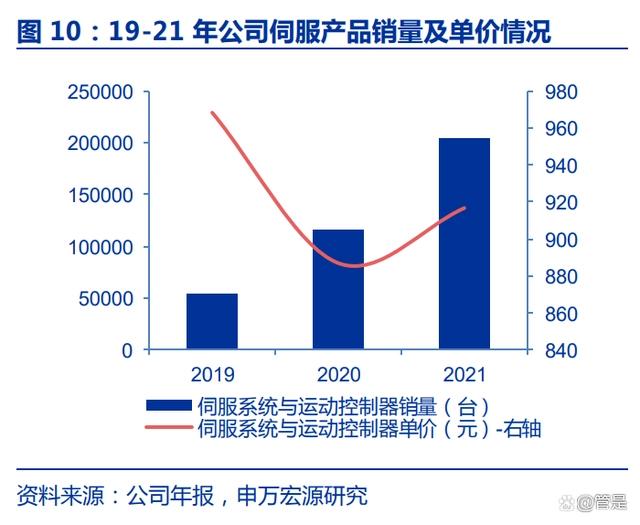 伺服系统与控制业务保持较快增长势头。2021 年,公司伺服系统与运动控制器实现销量 20.45 万台,同比增长 76.46%,均价上升至 917 元/台;伺服与控制业务营收实现高速增长,达到 1.87 亿元,同比增长 82.36%,营收占比达 22.89%。2022 年前三季度,公司伺服与控制业务营收为 1.78 亿元,同比增长 26.27%,营收占比提升至 26.80%。目前公司研制生产的伺服系统包括通用伺服系统和行业专机,控制系统产品主要包含 PLC 和运动控制器产品。近年来随着公司产品线的不断完善,公司已经能够为客户提供集成伺服系统和控制设备的完整行业解决方案,通过产品打包销售的方式促进收入增长,预计基于行业工艺的解决方案业务放量将成为未来公司业绩增长的重要驱动力之一。