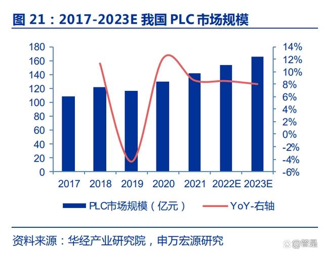 伺服与 PLC 均为百亿级高成长赛道。伺服系统和 PLC 主要应用于机床、电子制造、包装、纺织等行业。近几年,受益于国内制造业的自动化升级,以及锂电、光伏等新兴行业大规模扩产,我国伺服和 PLC 市场规模不断增大。根据中国工控网和华经产业研究院数据, 2021 年国内伺服和 PLC 市场规模分别达到 212/141 亿元,预计 2023 年国内伺服和 PLC 市场规模将达到 297 和 165 亿元,在 21-23 年间的复合增速将分别为 18.36%和 8.23%。