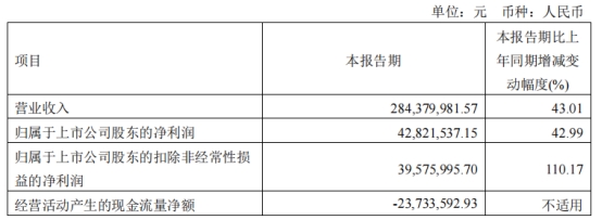 伟创电气2023年第一季度报告显示,报告期内,公司实现营业收入2.84亿元,同比增长43.01%;归属于上市公司股东的净利润4282.15万元,同比增长42.99%;归属于上市公司股东的扣除非经常性损益的净利润3957.60万元,同比增长110.17%;经营活动产生的现金流量净额-2373.36万元。