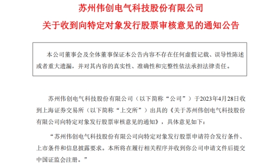 伟创电气(688698.SH)4月29日发布公告称,公司于2023年4月28日收到上交所出具的《关于苏州伟创电气科技股份有限公司向特定对象发行股票审核意见的通知》,具体意见如下:苏州伟创电气科技股份有限公司向特定对象发行股票申请符合发行条件、上市条件和信息披露要求。上交所将在履行相关程序并收到公司申请文件后提交中国证监会注册。