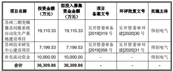 伟创电气最终募集资金比原计划多5520.75万元。伟创电气于2020年12月24日披露的招股说明书显示,公司拟募集资金3.63亿元,其中,1.91亿元用于苏州二期变频器及伺服系统自动化生产基地建设项目,7199.53万元用于苏州技术研发中心建设项目,1.00亿元用于补充流动资金。
