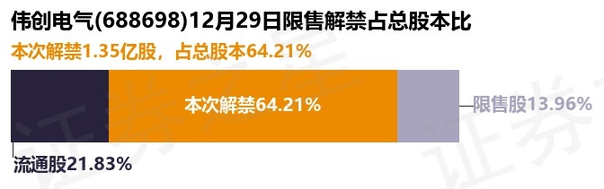 根据市场公开信息整理,伟创电气(688698)于12月29日将有1.35亿股限售股份解禁上市,为公司首发原股东限售股份,占公司总股本64.21%。最近一年内,该股累计解禁315.15万股,占总股本的1.5%。本次解禁后,公司还有2935.78万股限售股份,占总股本13.96%。具体如下图所示: