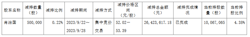 自本轮减持计划开始至今,肖治国已通过集中竞价交易方式合计减持公司股份500,000股,占公司总股本的0.22%,减持计划实施完毕。肖治国本轮减持总金额2642.36万元。