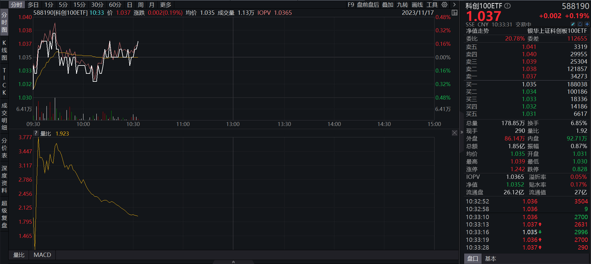 截至2023年11月17日10:33,科创100ETF(588190)早盘翻红,上涨0.19%,报1.037元,成交额达1.85亿元,市场资金持续关注。