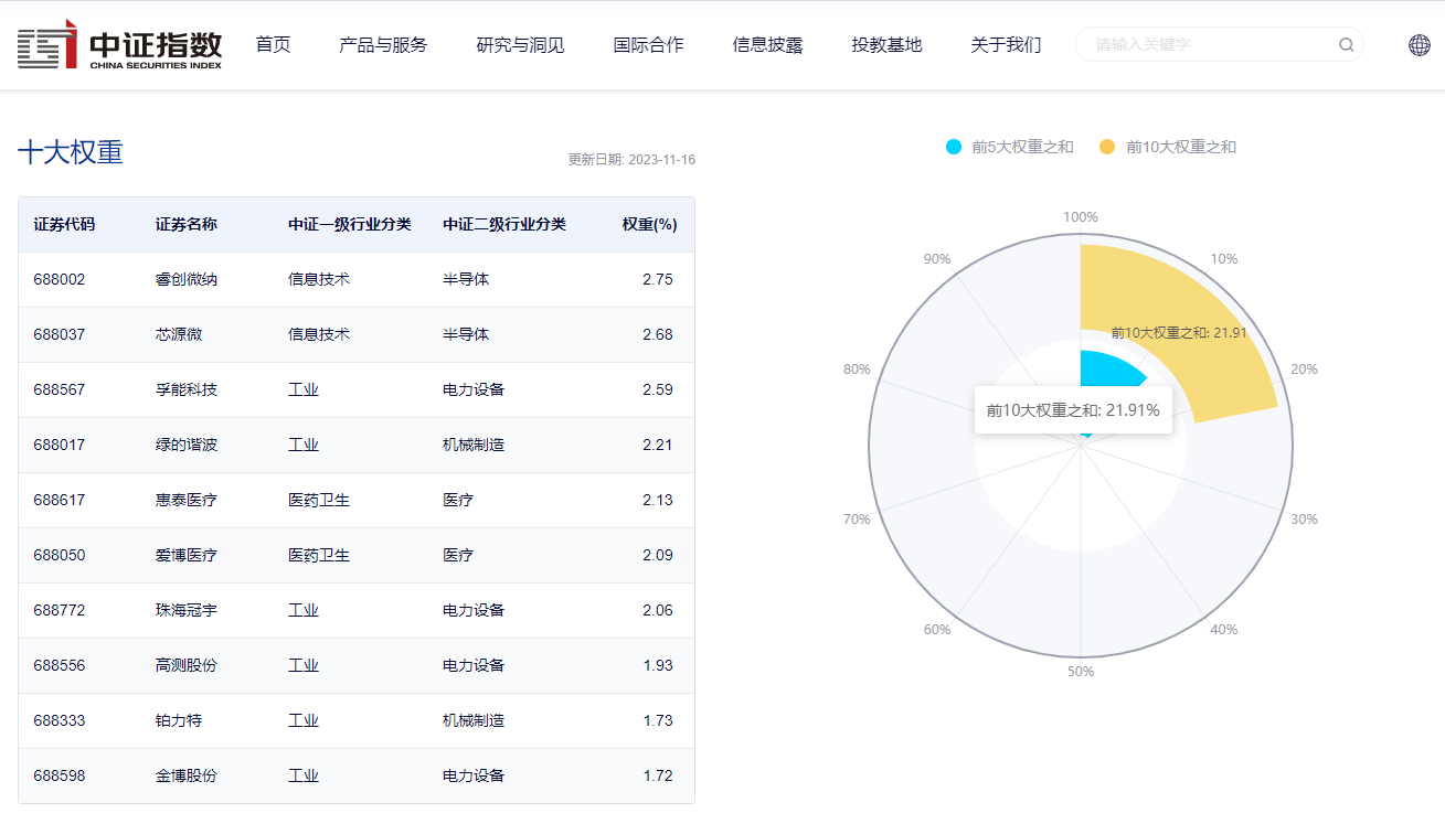 数据显示,截至2023年11月16日,该指数前十大权重股包括睿创微纳、芯源微、孚能科技、绿的谐波、惠泰医疗等,前十大权重股合计占比约为21.91%。(数据来源:中证指数公司,指数成份股不代表个股推荐)