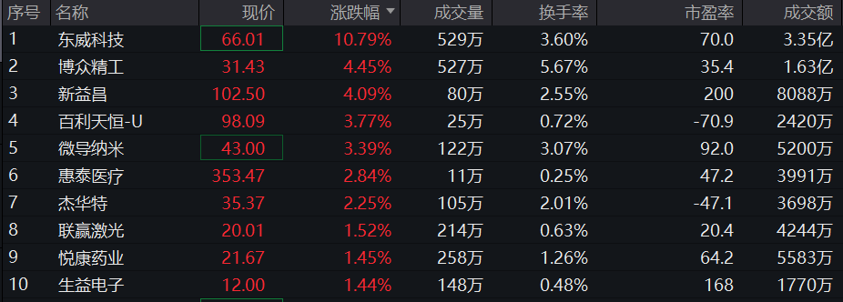 科创100ETF(588190)紧密跟踪上证科创板100指数,截至2023年11月17日10:33,指数成份股中,东威科技领涨10.79%,博众精工上涨4.45%,新益昌上涨4.09%,百利天恒-U、微导纳米等个股跟涨。