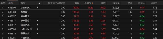 成分股中,东威科技涨16.82%,新益昌涨5.11%,博众精工涨3.92%,惠泰医疗涨3.65%,微导纳米、百利天恒-U、联赢激光、悦康药业等跟涨。