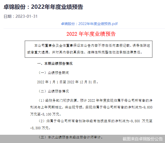 1月30日晚间,卓锦股份披露2022年业绩预亏公告显示,经财务部门初步测算,公司预计2022年实现归属净利润与上年同期相比将出现亏损,亏损额8100万-9600万元;此外,预计全年实现扣非后归属净利润亏损8300万-9800万元。