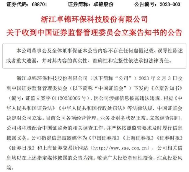 卓锦股份(688701)2月3日晚间公告,公司当天收到中国证监会下发的《立案告知书》,因公司涉嫌信息披露违法违规,根据《中华人民共和国证券法》《中华人民共和国行政处罚法》等法律法规,中国证监会决定对公司立案。目前公司各项经营管理、业务及财务状况正常。