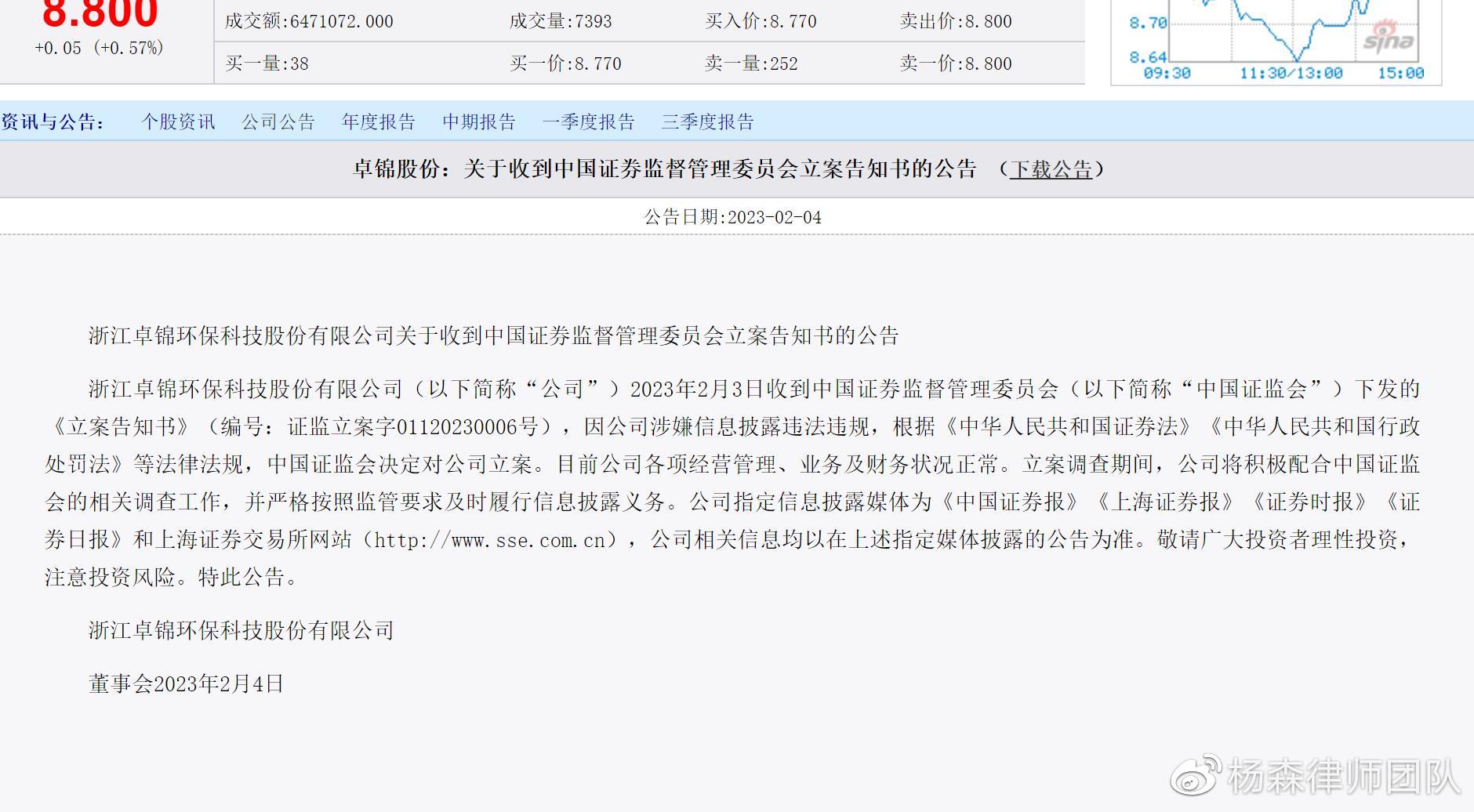 2023年2月4日,浙江卓锦环保科技股份有限公司(下简称“公司”或者“卓锦股份”)公告称,于2023年2月3日收到中国证券监督管理委员会下发的《立案告知书》(编号:证监立案字01120230006号),因公司涉嫌信息披露违法违规,根据《中华人民共和国证券法》《中华人民共和国行政处罚法》等法律法规,中国证监会决定对公司立案。