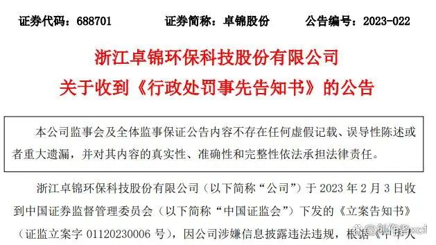 浙江卓锦环保科技股份有限公司(卓锦股份,688701)近期发布公告称,公司收到中国证券监督管理委员会浙江监管局下发的《行政处罚事先告知书》(浙处罚字[2023]6 号)。证监会拟决定对公司给予警告,并处以300万元罚款;卓未龙、姚群英、胡愚、王志宏等人给予警告并处罚款50万到300万元不等的金额。