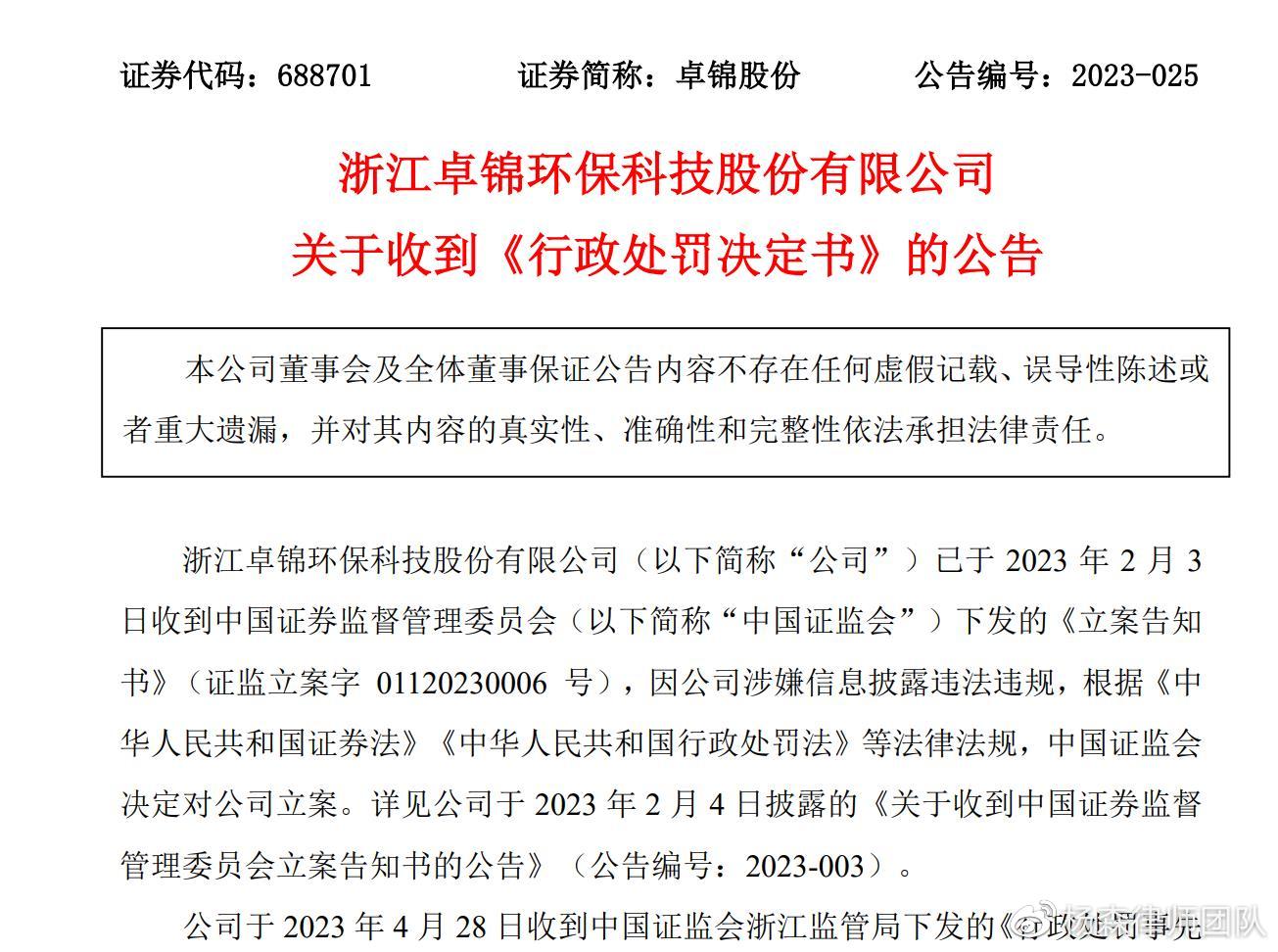 2023年5月20日,浙江卓锦环保科技股份有限公司(下简称“公司”或者“卓锦股份”)公告称收到中国证监会的行政处罚决定书。