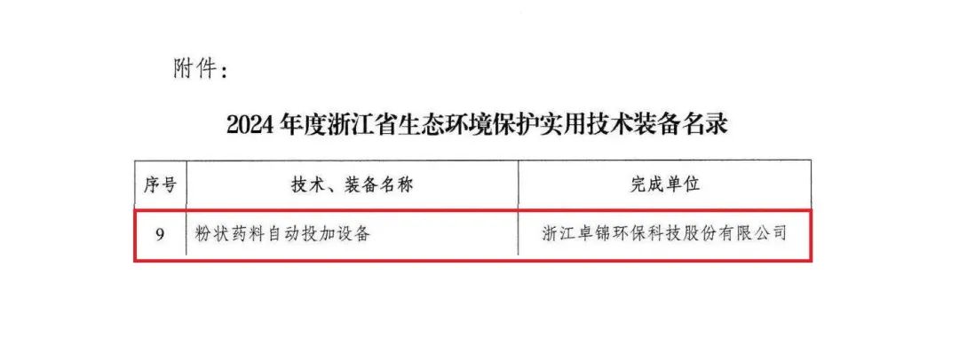 近期,浙江省环保产业协会发布《2024年度浙江省生态环境保护实用技术装备和示范工程名录》的公告,卓锦股份“粉状药料自动投加设备”成功入选“2024年度浙江省生态环境保护实用技术装备名录”。