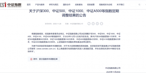 11月28日, 中证指数有限公司 发布《关于沪深300、中证500、中证1000、中证A500等指数定期调整结果的公告》,宣布对新一期的中证500指数样本进行调整,调整后新一批中证500指数样本将于12月12日收市后正式生效。