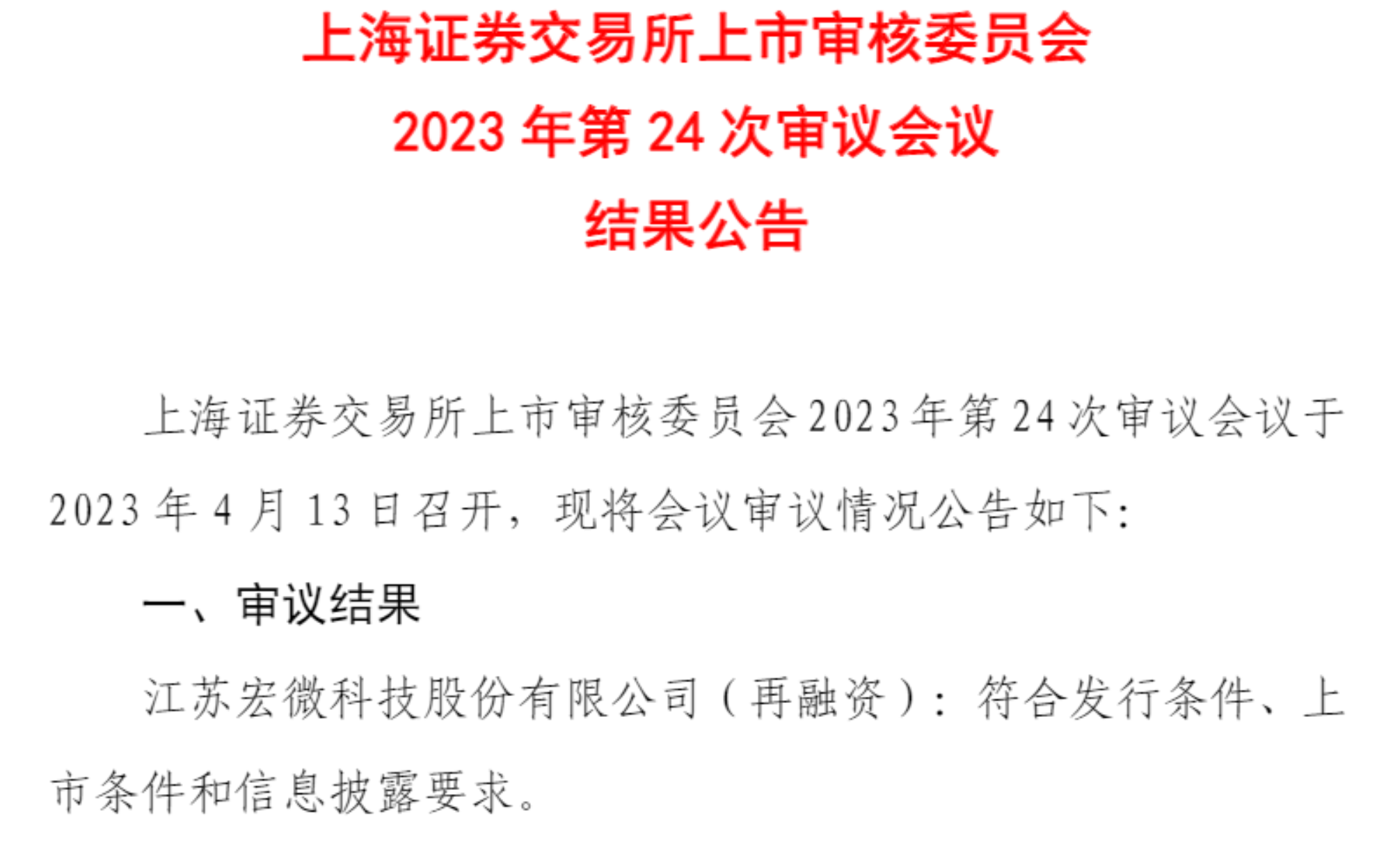 4月13日,据上海证券交易所上市审核委员会2023年第24次审议会议结果公告,江苏宏微科技股份有限公司(以下简称“宏微科技”)再融资符合发行条件、上市条件和信息披露要求。