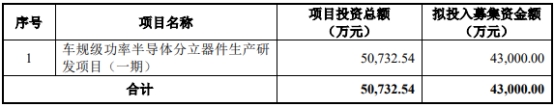 宏微科技2023年3月21日发布的向不特定对象发行可转换公司债券证券募集说明书(上会稿)显示,公司本次向不特定对象发行可转换公司债券拟募集资金总额不超过43,000.00万元(含43,000.00万元),扣除发行费用后的募集资金净额将全部用于车规级功率半导体分立器件生产研发项目(一期)。