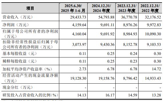 2022年、2023年、2024年、2025年1-6月,实现营业收入分别为32,176.52万元、36,770.78万元、54,793.88万元、29,433.73万元;净利润分别为9,972.83万元、8,976.26万元、9,691.11万元、4,159.64万元;归属于母公司所有者的净利润分别为10,090.30万元、8,984.93万元、9,691.92万元、4,160.04万元;扣除非经常性损益后归属于母公司所有者的净利润分别为9,103.53万元、8,152.78万元、9,430.36万元、3,073.97万元。