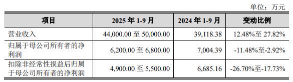 2025年1-9月,公司预计实现营业收入44,000.00万元至50,000.00万元,变动比例12.48%至27.82%;归属于母公司所有者的净利润6,200.00万元至6,800.00万元,变动比例-11.48%至-2.92%;扣除非经常性损益后归属于母公司所有者的净利润4,900.00万元至5,500.00万元,变动比例-26.70%至-17.73%。