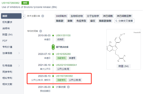 Pharmacyclics是全球首款上市的BTK抑制剂伊布替尼的研发者。从本次涉案专利授权时间来看,其刚刚在美国获得授权,专利应为US11672803B2,同样涉及一种BTK抑制剂。
