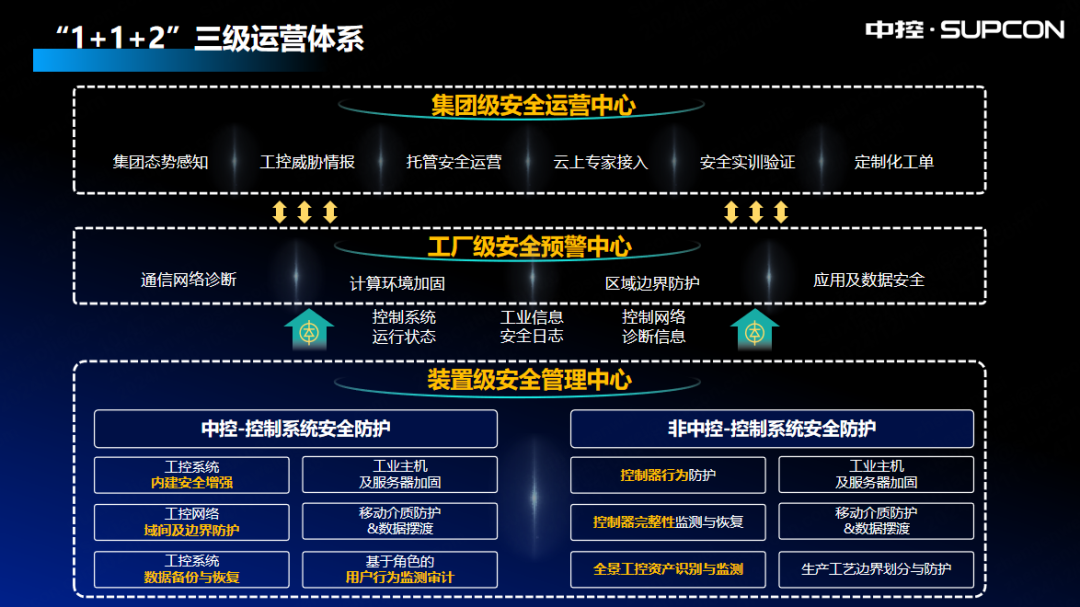 中控技术所提供的工业信息安全解决方案构建了一个从外到内自主可控的多层次的“内建安全、纵深防御、专业运营”防护体系。该方案提出了“1+1+2”的三级运营体系架构,包括1个集团级安全运营中心、1个工厂级安全预警中心及2个装置级安全管理中心(分别负责中控系统安全防护和非中控系统安全防护)。在装置级实现工控系统的基本防护,在工厂级实现设备资产的清点、通讯网络的诊断、安全日志的采集,在集团级实现威胁情报分析、定制化工单自动发送、云上安全专家接入。中控技术的三级运营体系通过分级管理的方式,为工业企业打造了一个层层递进、相互支撑的安全体系,全面保证了工业系统的安全,有效解决了IT与OT融合过程中的落地难题。