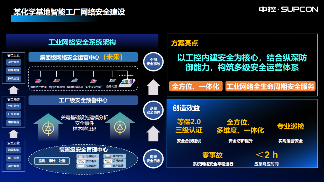 在某化学基地工程网络安全建设项目中,中控技术采用了三级运营安全体系作为技术架构,成功实现了包括DCS、IDM、APC、PID、AAS(报警治理)、电子SOP(操作导航系统)、Batch(批量控制系统)、WebSight全厂调度、5T无人调度、远程集控管理等复杂工业网络系统的整体网络规划及网络安全一体化建设。此外,中控技术还规划了多个基地的安全预警中心建设,并为其建立了集团级工业网络安全运营中心,从而实现了从装置到工厂再到集团的分级管控,为企业构建了一个层层递进、相互支撑的三级运营安全体系,为其数字化生产基地的建设打造了一个系统网络零事故的安全运营体系。
