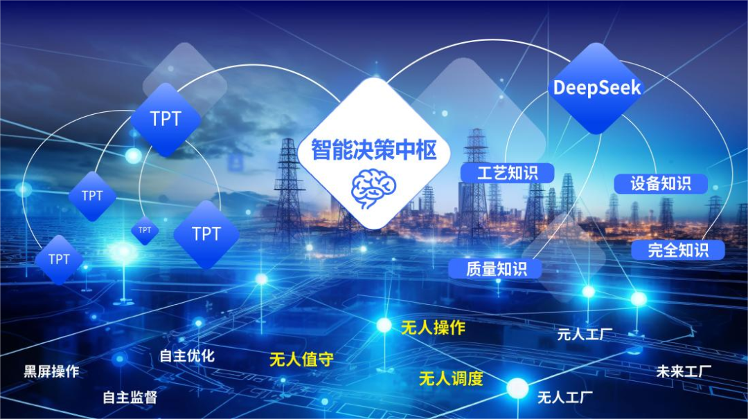 基于“时序智能+认知智能”双引擎,统一工厂装置的控制、评估、优化工作,全面提升工厂装置运行风险链、价值链的掌控能力。其中,DeepSeek知识沉淀与认知智能的能力,可全面提升装置运行的分析、诊断、交互能力,通过与TPT融合形成工厂的“超级大脑”,将实现智能感知、自动分析、自主决策、自动执行,将工厂装置少人化、无人化运行变成现实。
