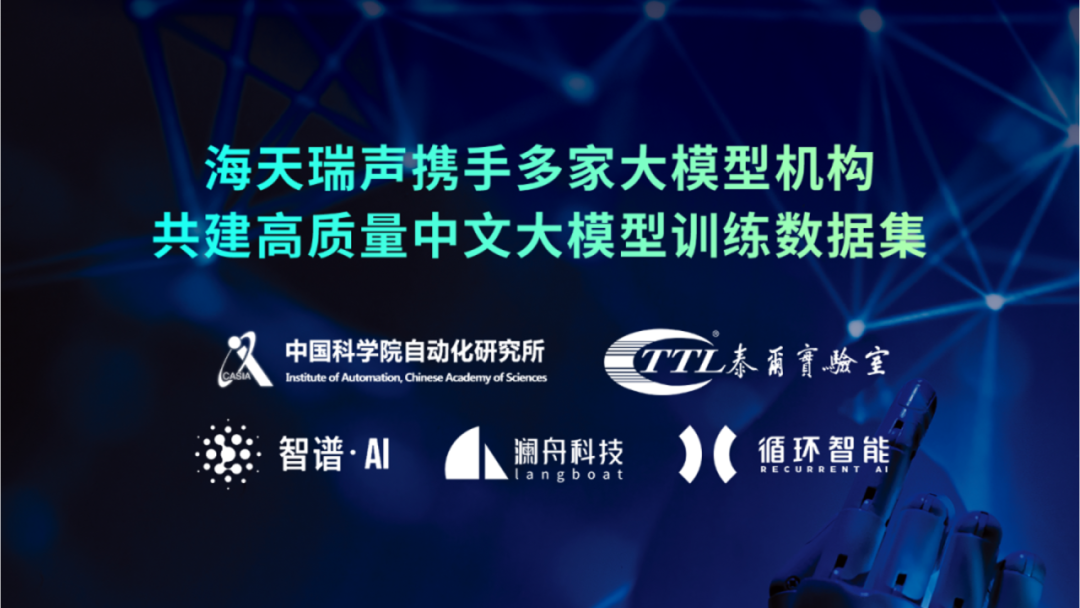 为了打造高质量中文语料库、围绕语料数据共建生态,海天瑞声携手中科院自动化所、中国信通院泰尔实验室、智谱AI、澜舟科技、循环智能,在2023全球数字经济大会中启动“高质量中文大模型训练数据集共建项目”,为中文大模型研发提供“加速度”。