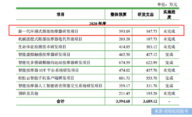 以新一代环颈式颈部按摩器研发项目为例,招股书显示:2018年、2019年分别投入380余万,2020年投入593.09万,但该项目在三年时间并未完成。在半年报及三季报中,暂未披露该项目的相关信息。