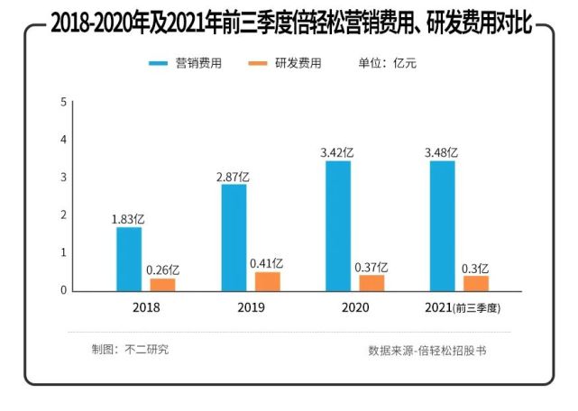 「不二研发」发现,倍轻松的营销费用、研发费用的倍数差异逐渐扩大。2018-2020年,其营销费用分别是研发费用的7.15、7.06、9.27倍;2021年前三季度,该数据扩大至11.6倍。