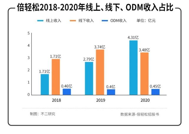2018-2020年,其线下收入为2.9亿元、3.74亿元及3.48亿元,营收占比57.22%、54.03%及42.23%;在2020年,线下收入被线上收入反超。