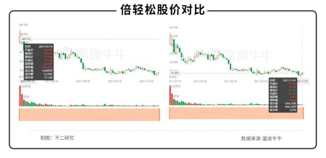 上市即巅峰之后,其股价波动式下滑;截至11月1日收盘,倍轻松报收91.89元/股,对应市值59.64亿元,与其上市首日盘后市值相比,市值下跌43.2%。
